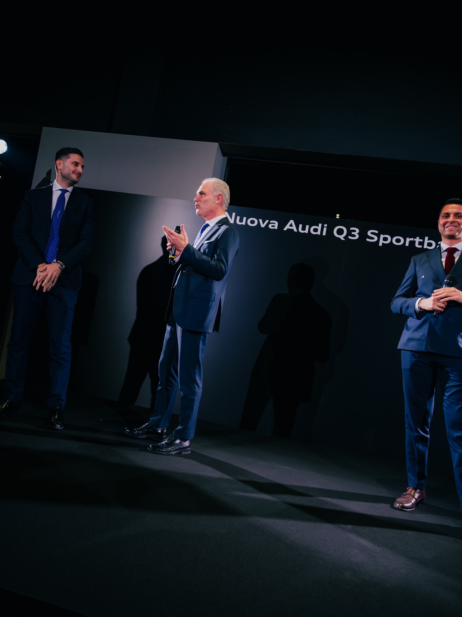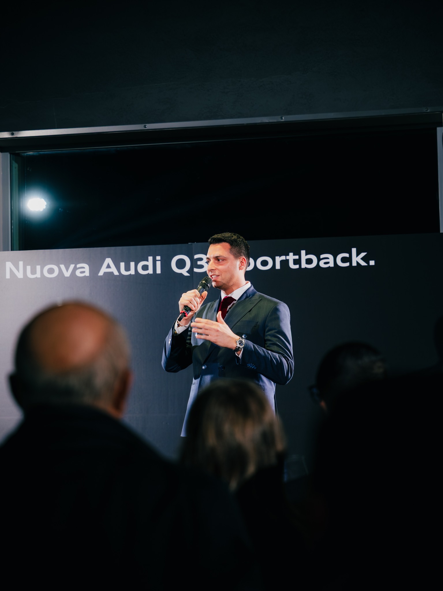 Dopo l’accoglienza e il buffet, sul palco sono intervenuti i nostri Audi Manager Andrea Cola Zannier e Simone Ciaramellano, insieme a Fabio Leggeri – Head of Sales Field Force Audi Italia, guidando il pubblico alla scoperta di un modello che unisce design, carattere e sportività.